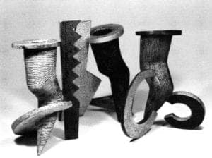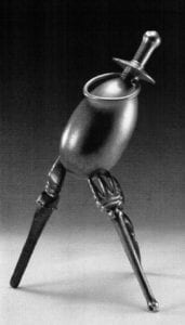 The tall sculptural brass, bronze and aluminum stand that Tom Muir gave his sterling bowl in Untitled Hollowware was likely intended to give the bowl added credibility. Might the bowl have been appreciated/accepted as the finely crafted, well-proportioned traditional form it is? Probably not in his circles. Is it more or less a fine piece because of the added base? Will anyone dare present a pure form as a pure form ever again? Marcus Amshoff's two die-formed copper vases are practically that: simple, captivating forms that reveal their die-formed manner of origin and then call to the viewer with their electric blue patina. They are fine pieces where simple form is the statement. Dale Wedig, guest lecturer for the accompanying symposium, exhibited two symmetrical raised vessels. One, Great Pumpkin Vessel an awesome 30 x 16″, is intersected with constructed channels, painted in colors that contrast with the soft orange, body color. It is evenly patterned by cutting through the paint revealing the copper body. This timeless and elemental form certainly belies the technical virtuosity of its maker. That it could be the work of the same mind and hand as the series of three cast aluminum sculptures also shown by Wedig is amazing! These identical crude forms with their differing body textures and appendages, all painted, seem to be disguised as ceramics, which they just as well could have been.