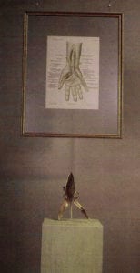 With exacting precision Barello set up a compelling push and pull between the objects of Adornments that holds viewers in its gravity. The dynamic of the jewelry (sculptures in miniature,) and the medical texts (exacting works of lithography) generated a swirl of ideas. What is shared between objects that rest on top of our skin and those that lie beneath the dermis? Does the gold-plated adornment hold more aesthetic appeal than the flesh and blood that lie beneath? If beauty is skin deep, why do we go to such incredible lengths to cover it with objects such as those Barello has created?