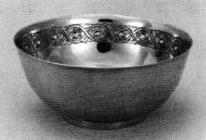 Stylistically Fabergé was not a great innovator. In a period when Paris was leading a Rococo and later a Louis XVI revival, he went along, designing with a rather heavy hand in the Rococo vein, yet producing neo-Classical pieces much more delicate than the originals they imitated, as in the numerous cigarette cases, dance programs and picture frames often commissioned as gifts by the royal family. The examples shown here of his Art Nouveau ventures are mostly stolid and unimaginative, as poorly conceived as the Doulton and Galle vases for which he contrived the mounts. More original, though not particularly tasteful to this late-twentieth century eye, are the works designed in his Moscow workshop in the neo-Russian style. Using ancient Russian motifs, he produced hollow ware with broadly outlined angular and curvilinear designs, and single coloured opaque enamels. Miniatures of paintings by Russian artists appear on some of the boxes in this style. There are some magnificent pieces among them, such as the traditional Russian ceremonial cup known as a kovsh, with its delicate cloisonné work combining both neo-Russian and Art Nouveau designs, embellished with shaded enamels.