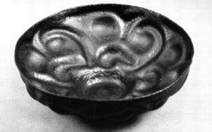 Boxes and containers of all kinds have been born in Prip's studio since the form arose as a less limiting vehicle for expression in the 1960s and loosened the grip of traditional functional vessel forms. The enigmatic silver and gold Fish Box with Lid (1965-66) gives us the whole creature as container with adorned silver lid. The humorous Willy's Bone (1969) and Finger Box (1970) are containers made in the shape of human body parts. Leaking Box No.2 (1970) plays with the illusion of liquid metal. Later containers like the monumental Steel Container with Lid (1989), a slim rectangular sheath or the bronze Sumo Jar (1985), rotund in shape, carry an aura of ritual and tradition. Most recently, the artist has collected small, oval stones from the seashore. At first he used sandblasting techniques to radically alter their texture, creating script-like raised patterns on some, face-like designs in others. Later, he sandblasted a cavity, polished the stone and added his own stamped silver lids decorated with abstract patterns and symbols. Collecting and altering a natural product for domestic or ritual use is a timeless human activity. Following that impulse, the exquisite union of nature and culture in these small objects proves extremely satisfying.