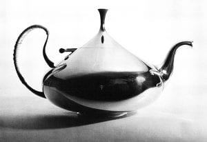The technical precision and appreciation of essential natural form seen in the altered stones is apparent in the silver tea and coffee pots and flatware from the 1950s in the center of this room. Prip's raised Onion Teapot (1952) exemplifies the clean lines of mid-century Scandinavian design. (Happily, it has been purchased from the exhibition by a donor for the Boston Museum of Fine Arts). Prip learned the technique of wrapping rattan to shield the heat conducting handles for a number of his teapots. The sleek Diamond Coffee Service and Lark Flatware (1957) made as Prototypes for production by Reed and Barton Company are included in this display case. Prip's ability to hand raise a prototype with an understanding of how it would be put into production on the factory floor was a rare skill in America.