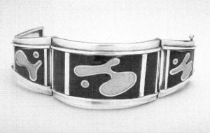 An enameled bracelet is a striking work from the 1950s. Hinged in four tapering sections, orange and green color fields float within a black background. The evolving green shape, distinct within its heavily cloisonnéd border, would delight the likes of Phillip Morton with its quintessential modern art form, while at the same time the glossy opaque colors allude to Japanese laquerware.