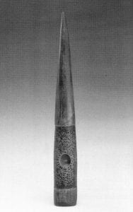 Small warrior figures, no taller than a couple inches, are composed of numerous gold pieces (at times up to 25 individual pieces). Ingots of gold were hammered, then molded into the three-dimensional forms and soldered together. Intricately rendered, the figure was dressed in ritual attire complete with headdress, nose-piece, ear spools, and a baton of office. In contrast, some objects were life-size, the actual ornaments of office worn by warriors, priests and rulers. The most impressive was a curious item called a back flap, worn from the back of a belt, by high ranking members of the military. From a practical point of view it was, possibly, used to protect their backside, symbolically it identified rank. Even with no knowledge of Moche culture one could simply admire the elegant lines of the object, long and narrow with a faring edge at one end, cast of gold. The exhibition climaxed with a life-size mannequin dressed in reproductions of the Warrior Priest's ceremonial regalia. With or without the reincarnated Warrior Priest as a surprise finale, it was the richness of the objects found in the tombs that encouraged the mind to imagine visual answers to the questions offered by the intriguing metalwork - the who, the where, the when, the where, and the why.
