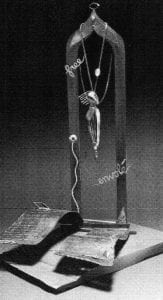 French and English texts accompany Kaplan's series, contributing another layer of meaning to each amulet. Integrated into the bases as sculptural elements, they are the result of Kaplan's collaboration with Canadian writer Nancy R. Lange. It is an interesting collaboration which can be interpreted as a reference to a tradition of amulets containing words - usually words from a scripture, Lange's texts serve as complements to Kaplan's amulets, further elucidating their intended meaning. For example, in Moon Birth, Lange tells the story of a woman near death who finds life again by freeing herself from the traps which bind her. In the midst of describing the woman's last moments, Lange wrote "life pulses in her throat", suggesting that the woman's voice is her key to survival. The idea is played out visually in Kaplan's amulet: a woman hangs from a noose around her neck, and in this moment when she is being strangled, she must choose between life and death. Affirming life, the woman articulates two words which are scripted in brass and rise up beside her: "free" and "envolé", meaning "flight". Here again, Kaplan simultaneously asserts the positive and acknowledges the negative, capturing them both in a moment of transformation.