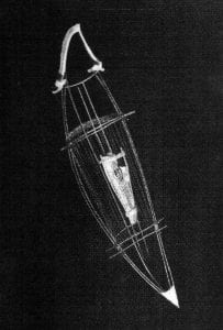 The resulting collection of jewelry and sculpture incorporates a variety of materials ranging from cast off junk, rock, bone, steel, silver, and pearls to precious metals. Dory Study is fabricated of sterling, edged with 18k gold. A pair of earrings incorporates found objects, discarded bottle caps from the Deer Isle Laundromat parking lot, reworked and juxtaposed with German silver and 18k gold, sensitively transformed. Local pearls from Eggemoggin Reach provide a regional charm. "I wanted to use truly local material, items close to the core of what one experiences living on Deer Isle", Martin states. Also exhibited are steel wire studies of a Rushton guide boat, an Alaskan skin boat and a pea pod. Her steel constructions, minute and intricate, cause quiet introspection.
