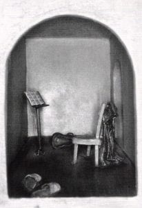 The rooms, too, have a strong presence in spite of their tiny size. Most open onto shadowed spaces introduced by a cracked door, a balcony, an alcove, staircase, or hallway. Sometimes, if we crane our necks, we can glimpse another room through the opening. These rooms are the rooms of our dreams. Jaquez uses rapidly receding perspectives which enhance our feelings of mysterious, infinitely connected spaces. The images of Giorgio de Chirico came to mind as I sensed the empty spaces of Jaquez's work. Empty, because no human figure is present, yet full, because the objects and architecture convey a strong anthropological presence which invades the emotional spaces of our dreams. The personification of inanimate objects is clearly intended by the artist who recalls that her family humorously referred to their lumpy old couch as los comadres, the old gossiping godmothers, a title she gives to one of her pieces.