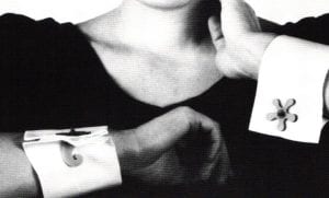 Stylized floral cufflinks of strong, dynamic form made of orange and olive green acrylic; three individual bracelets composed of numerous identical elements executed in felt, bronze or thin sheets of red acrylic; a necklace and bracelet of curving stainless steel springs spaced by wooden balls with a worn orange patina; fun and functional; studied and experimental; tension and inertia: Aspekte von Serie is an exhibition presenting the work of thirty-three young designers. There is an air of risk, study, and experimentation present. Within this work the individuals who were able to solve problems of design and imbue their work with an individual personality created work that stood apart demonstrating both the breadth and depth of the designers.