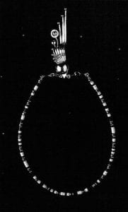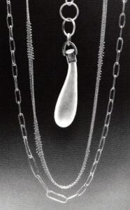 Furthermore, artists began to introduce alternative materials such as acrylic, bone, and fabric. A necklace created by Sandra Noble Goss with nineteen clear acrylic claw-like cylinders, is a good example of this trend.