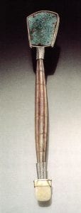 Marjorie Simon's pieces also depend upon an interest in contrast. However, she achieves this not through a single material and color, as in the case of Parkin, but through an amalgam of textures, mixing different materials and hues. Simon concentrates her efforts on brooches and pendants that allude to objects from the past, specifically, articles of ritual and magic. She uses silver, gold, copper enamel, found objects, and semiprecious stones to create wearable objects that are at once modern and antique. Her brooches refer in their designs to ritual staffs of pre-industrial societies and to decorative objects of the ancient world, such as hand mirrors from ancient Rome. Their irregular forms and contrasting materials, especially the sometimes partially unfinished semiprecious stones, contribute to the connections to a long ago past when myth was given as equal importance as rational thought.
