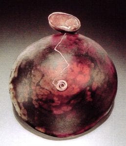 A native of South Korea, Chwae moved to Wisconsin at the age of ten. Straddling two cultures, Chwae says she does not fully identify with either, but considers herself an observer of both. In her copper American Toad bowl, she mixes East and West with wry humor. Here tadpole shapes and the American toad's webbed footprints track across the earthy interior of another double-bowl construction. Echoing traditional Chinese vessel shapes, the inner bowl is layered with blue and brown patinas, while the darkly mottled exterior was treated with a sawdust patina. Imbedded in this murky realm, the fossil-like imprints suggest a trek through time - and mud as well.