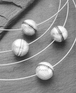 A commitment to wearability, and an appreciation for the harmony of rhythm shows itself in all the work on display: the Wave Ball groupings, the Sinuated Trumpet series, and a classical necklace of alternating tubular gold beads and natural aquamarine crystals. Often the fluid counterpoint of an intricate catch is played against the dominant elements of progressive and repetitive rhythm; such as the surprise of a delicate shell catch against a string of pearls, or a diamond set catch nestled almost hidden among a row of wheat grains.