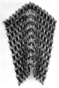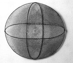 Ferguson's works are the most abstract of the show. Most are geometric in shape and veer between being visually heavy and appearing airy. Being, a dense 1½' sphere, is constructed of black 1½" pins. Unlike a ball of string or a collection of tin foil, Being retains an unusual depth when studied, yet at a glance it is visually heavy. The depth of the viewer's participation makes the difference. Vertical Wave, displayed adjacent to Being, is constructed with a very open, hexagonal weave of 2″ black pins. Flat and stretching upward about 10′ and hung from only a few points it is a graceful, flowing form with an outward bulge.