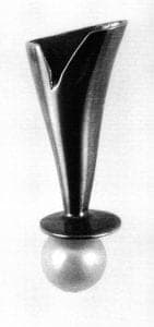 Scherr continues to demonstrate a sure sense of the engineering and architecture of the human body. While these works have a cool elegance in a case or on the wall, they come to life on the body - an advantage of a retail gallery show where viewers can interact with the jewelry. A simple yoke of stainless steel, as spare as a minimalized antelope head, springs to life as an echo of collar bones and shoulder blades. Mobilia devoted an entire case to Scherr's Waterfall jewelry of liquid silver and round gold beads strung in flexible spray-like arrangements that become kinetic sculpture on the body.