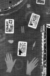 In Fortune's Gate, a decorated jacket floats before a large painted board overlaid with words and rimmed with colored paper squares. Spelling out questions about paths and choices, the words correspond to the jacket's details of forged wire, acrylic symbols, and tarot cards. This work holds a balance between personal intrigue and an overriding sense of universal mystery. Chase's work is intimate and serene.