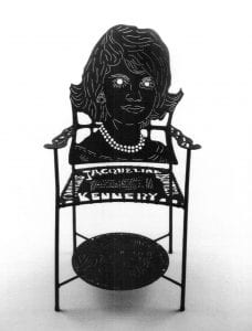However, Jacqueline Bouvier Kennedy Onassis has a more simplified line drawing of the face with two larger see through eyes and in general seems more successfully conceived and executed. Her string of pearls before a windowpane backdrop at least create more spatial interest. The portrait chairs are also a clever update on Victorian cut paper silhouette portraits.