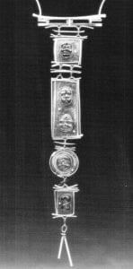 Fortunately, when I saw Barbara Heinrich's work at Susan Cummins Gallery any preconceptions I brought with me were dispelled. Heinrichk new pieces continue to work within the tradition of the inherent qualities of material beauty which gold and gemstones possess. But at the same time, her work captivates by recalling, but not copying, design sources ranging from the historical, in the Wheat Grain series, to the ethnic in the Shield series, and then onto celestial mysteries with both the Orbit and Milky Way pieces. In addition to the objects initial appeal, Heinrich's work continues to intrigue viewers as it maps a path of inquiry that includes an amalgam of stylistic breadth, references to her medium, and a self-imposed, personal approach to design problems.