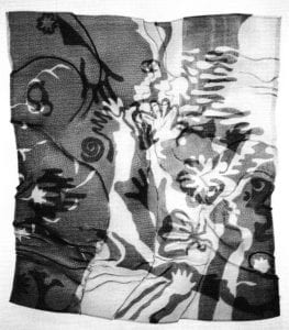 Elliot crimps and layers the mesh of her large airy panels (up to 4 by 5′) often including wire shapes and graphic images. Her smaller format panels are more traditional mesh and paper collages mounted on board and framed under glass. The bodies of Chase's sculptures are made rigid by the use of spacer bars and triangular copper shapes that she laboriously sews to the edges. Both artists use multiple layers of mesh that add strength as well as allowing for a greater visual and conceptual depth. Ferguson has learned well the language of pins and uses this knowledge to create both stiff and flexible woven works.