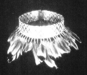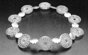 Influenced by recent archaeological findings in Peru, Fisch titles one of her most compelling necklaces Inspired by Heroes: The Moche of Sipán, 1995. Ample beads, three inches in diameter, made by affixing diaphanous patterns of knitted silver wire to silver rings (one lined in copper, the next in gold), alternate with smaller silver buttons to fashion a necklace worthy of Napoleon's empress, on whose bust it is displayed.