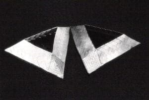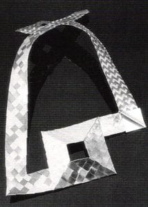 Impressive, too, are the varied effects which Fisch achieves in the geometrically inspired pieces of the early '90s. Using both zigzag and diagonal braiding techniques in several widths of gold, sterling, and oxidized silver, she fashions works which recall, because of their boldness and significant dimensions, the pectorals of the past. An asymmetrical construction, Black + White + Gold, 1992, for example, places a dramatic hollowed square over the chest and another as a counterbalance behind the neck. A second striking piece, Five-sided Plaid, 1992, joins five lengths of various braids; the tension thus engendered provides graceful curves to the work. Removing one of the detachable sections makes a very different, close-fitting necklace. Smaller but no less handsome is a pair of bracelets, Black and White Triangles, 1992, resembling truncated pyramids: one, in sterling; the other, oxidized silver. Each is accented by a diamond shape of 18k braid. These are meant to be worn together on one arm or separated with one on each arm.