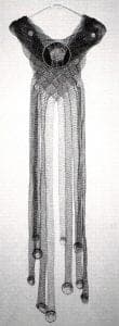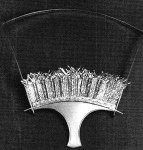 Tending to blur distinctions between jewelry and garments are the machine-knitted works of copper wire coated with colored resins. A fair of burnt orange and red, Ruffled Collar, 1993 surrounds the neck with a double flourish of wide, billowing ruffles. A silver clasp anchors the exuberance, and two narrow knitted tubes dangle like ribbons. Even more audacious, Multicolor Braid with Silver Flouters, 1995 is constructed of long tubes in deep blue, purple, pink, and several shades of red. Braided to form a kind of bodice, the tubes of varying lengths in front of the garment fall freely toward the floor, each culminating in a pleated circle of silver. Silver flowers of similar construction adorn the bodice.