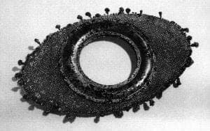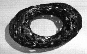 Technical breakthroughs are not evident. Several of the works exhibit excellence when metalsmiths use their skills to etch, patina, electroform, and weave their materials. Best of show in this group are pieces by Yuko Yagisawa, Valerie Hector, Billie Jean Theide, and Rob Peacock. Minimalism is treated with unusual sensitivity by Sue Amendolara, Julie Mihalisin, and Tom Odell. I'll take rubber in the hands of Eric Margry and acrylic designs done by Marcia Bruno. I have difficulty when a link of bundled plastic bread ties is cited as art jewelry but I respond strongly to recycled materials creatively treated by John Grant and Harriete Estel Berman.