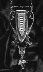 A show of this kind sets up expectations of viewing not only one-of-a-kind works, but works uniquely considered in view of the assignment, that is: works that yield a different experience than what you expect to get from the jewelry counter at Nordstroms. So I was disappointed by the casual level of operation in the approach of some of the work, as if the two very different forms of the fibula and the pendill are now considered interchangeable simply for their potential to isolate an art object against the body. A number of these neckpieces approach the pendant from the more pictorial format of the brooch. Format becomes interchangeable as brooches metamorphose into pendants as the result of removable hardware and suspension. Chris Giffin's work is one such example. Her large and captivating, yet essentially frontal pieces, would appear to be more comfortable both worn and considered as brooches.