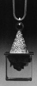 While rethinking my understanding of the distinction between one-of-a-kind works in series and production work, I was still concerned by the anonymity of much of the work. Aaron Kramer's well balanced pendants, often incorporating elongated drops carved from Catalin and Delrin rod, offer clean geometries, flawless craftsmanship, and a wearable scale. While playing out more intimate variations on his usual work with cast-off industrial materials, Kramer's materials were handled in a uniform way that reduced them to the quality of any material and caused them to lose part of their potential impact. Terry Porter's abundant pieces could have benefited from editing. Some, such as Eye Pendant were much stronger than others. And Patty Chaney's well-crafted, high-end sea shell neckpiece seemed embarrassingly out of place, and as a necklace, it failed to meet the basic requirements of the exhibition.