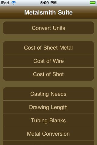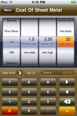 Metal cost calculator. There are three buttons that allow you to calculate the cost of metals in three different forms: sheet, wire, and grain. Using the click-wheel, you choose how much you need of a particular alloy, and the app retrieves the daily spot price from the Kitco website. You then type in the daily spot price for a specific metal into a new window display, and the app calculates the cost of what's needed. This might be a little easier to use if the app had a button to automatically input the spot prices in these windows for you; however, it is still much faster and easier than my previous method of metal cost calculation, which involved going online to find the day's spot price and using several different calculations (and a little guesswork) to arrive at a price for each different form of metal.