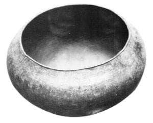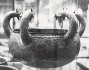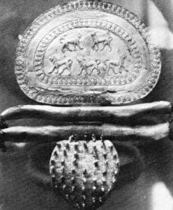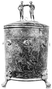The Etruscan Museum (Museo Gregoriano Etrusco) is of foremost interest to the metalsmith with its Room of the Regolini-Galassi Tomb, Room of Bronzes and Room of Gold (Sala di Ori). The Room of Gold is presently closed to the public; however, it is possible to view the Etruscan and Roman jewelry by making a request at the information booth at the museum's entrance on Viale Vaticano. A one-half hour visit is allotted and photography is permitted. This Is a small collection but worth the extra effort to see the delicate funerary diadems and hollow-formed granulated earrings. The Regolini-Galassi Room contains treasures from excavations of a 7th-century B.C. Etruscan tomb in the necropoli south of Cerveteri. The bronze, ceramic and gold objects are spectacular, especially the massive repoussé and profusely granulated gold fibula and also the enormous raised and embossed bronze cauldron with six griffins projecting over the rim. Objects within the Bronze Room comprise an impressive collection of Etruscan metalsmithing in their form, scale and craftsmanship of articles, ranging from helmets and bosses to candelabra, pitchers and urns.