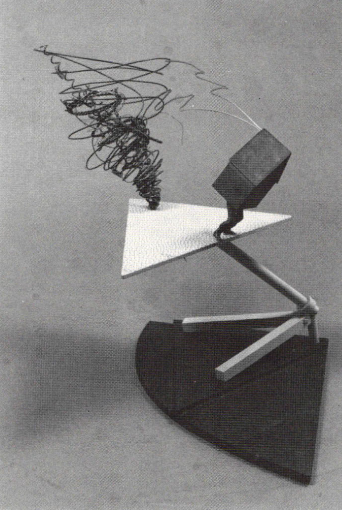 Linda Threadgill also used photoetching in works such as Shutters, a wall relief which seemed to unfold like a book. She has created a fascinating range of textures using silver, brass and wood. By spraying acid on thin sheets of metal she has been able to simulate the diaphanous effect of falling leaves. Kate Wagle's gleaming blue 3D B. C. soared in space, suggesting a bird in flight or a phoenix rising from the flames. Wagle has opted to work on a monumental scale and to incorporate modern materials like auto-body paint and glitter. However, here the reflective blue surface was reminiscent of traditional enamel work. The form itself was dynamic and sleekly modern. Although Thelma Coles's Confinement Denied and Mutual Dependency employed a modified cubist vocabulary, their titles had human references. In Confinement Denied the artist experimented with the relationships of planes and lines in space, contrasting the highly polished metallic surfaces with the irregular soldered silver wire fringe at the top.