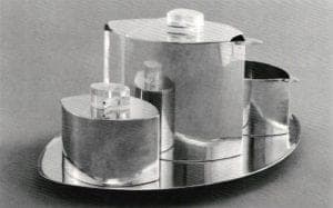 Bertoia's metalworking had been limited to jewelry at Cass, but Cranbrook's equipment enabled him to produce holloware as well. One of several coffee/tea sets he made is now in the collection of the Cranbrook Academy of Art Museum. With their clear, clean, silver surfaces, the vessels almost seem sliced from solid blocks. Their high polish fits within the 1930s and 1940s esthetic of Eliel Saarinen (Director of Cranbrook from its inception in 1925 to 1946) and other Scandinavian modernist designers. This service and the Kamperman service, now at the Detroit Institute of Arts, seem too impersonal, too resolutely unadorned to relate to Bertoia's work as a whole. Although produced with consummate skill and a sophisticated sense of design, they do not emit the evocative mystery that surrounds his other work in jewelry and large-scale sculpture.