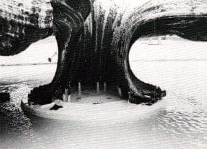 Working in a series allowed Bertoia to refine certain ideas. The last in a series of three fountain designs was commissioned for the courtyard of the Manufacturers and Traders Trust in Buffalo in 1968. It was constructed of copper tubes, oxidized and bronze-welded into an indulating, robust form, organic in inspiration. Unlike Sunlit Straw, the fountain uses a solid membrane to define a surface, rather than a series of points.