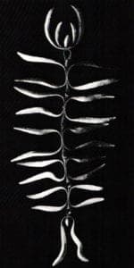 The series culminates in the elegantly whimsical Ornamental Centipede of about 1942. Here Bertoia expands his jewelry scale, which was frequently quite large, to a nonwearable size. Ornamental Centipede was intended as a kind of table centerpiece. With its flexible joints and tactile surfaces, it was certainly meant to be handled and rearranged. Here the faceted petals are attached as vertebrae to a spinal column, forming a swimming/crawling creature of primal construction and delightful nature.