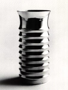 Bertoia's metalworking had been limited to jewelry at Cass, but Cranbrook's equipment enabled him to produce holloware as well. One of several coffee/tea sets he made is now in the collection of the Cranbrook Academy of Art Museum. With their clear, clean, silver surfaces, the vessels almost seem sliced from solid blocks. Their high polish fits within the 1930s and 1940s esthetic of Eliel Saarinen (Director of Cranbrook from its inception in 1925 to 1946) and other Scandinavian modernist designers. This service and the Kamperman service, now at the Detroit Institute of Arts, seem too impersonal, too resolutely unadorned to relate to Bertoia's work as a whole. Although produced with consummate skill and a sophisticated sense of design, they do not emit the evocative mystery that surrounds his other work in jewelry and large-scale sculpture.