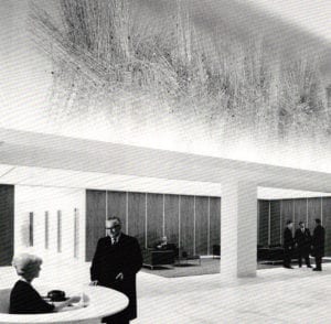Working in a series allowed Bertoia to refine certain ideas. The last in a series of three fountain designs was commissioned for the courtyard of the Manufacturers and Traders Trust in Buffalo in 1968. It was constructed of copper tubes, oxidized and bronze-welded into an indulating, robust form, organic in inspiration. Unlike Sunlit Straw, the fountain uses a solid membrane to define a surface, rather than a series of points.
