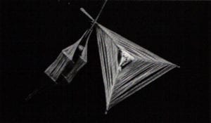 "The sounding pieces are sculptural works that produce metallic sounds when acted upon by an external force, moved by the wind, struck or strummed by hand. These sound-producing pieces can be categorized in three groups, varying in form, size and sound: gongs, singing bars and the largest group, vertical clusters of interacting wires or rods attached to a base. The base rests on either a resonation box or dampening cushion, which modifies the sounds. The vertical clusters range from short groups of bristly wire to limber groups of ½ inch rod, some approaching 10 feet tall. The tonality and its duration are dependent on the length, cross section, alloy and intensity of force exerted on the piece. These clusters look and move much like their earthly inspiration—clumps of wild grass or reeds. The gongs, some rectilinear, others amorphous, are cut from plate or are hollow fabrications. These pieces are played by either striking with a mallet or stroking and scratching with felt- or rubber-tipped tools. Of limited visible motion, they emit a variety of sounds. The last group, singing bars, are short lengths of thick bar hanging from the ceiling. Positioned so they swing and clang together, dancing in space above the other pieces, they make clear, bell-like sounds, accenting the activity below."