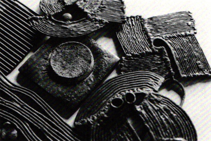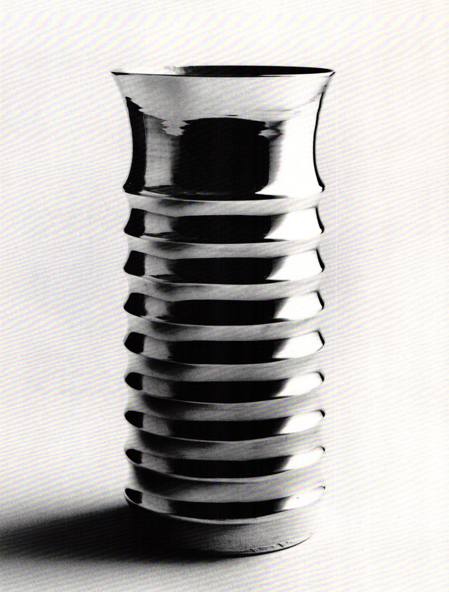 There is no doubt that Bertoia was fascinated with surfaces. A bronze vase made about 1940 shows clearly his interest in the purely reflective nature of metal. The highly polished golden surface undulates in repetitive, soft angles, distorting the reflection and causing the whole piece to move with an organic sense of growth The coffee/tea sets and this vase indicate one extreme of surface treatment that Bertoia explored and then abandoned in favor of more subtle finishes It may have been his interest in surface texture that drew him away from holloware, for he produced it only during his Cranbrook years, 1938 to 1943. On the other hand, practical considerations probably contributed to this disinterest. In the spring of 1943 the Cranbrook metal shop closed and shortly thereafter Bertoia left for California and design jobs in defense industries. Bertoia's jewelry production, on the other hand, extended throughout his career and may have served as small-scale studies or sketches of ideas and techniques. The jewelry is improvisational by nature, freely exploring ideas of space, texture, movement and a kind of organic liveliness difficult to translate into larger pieces.