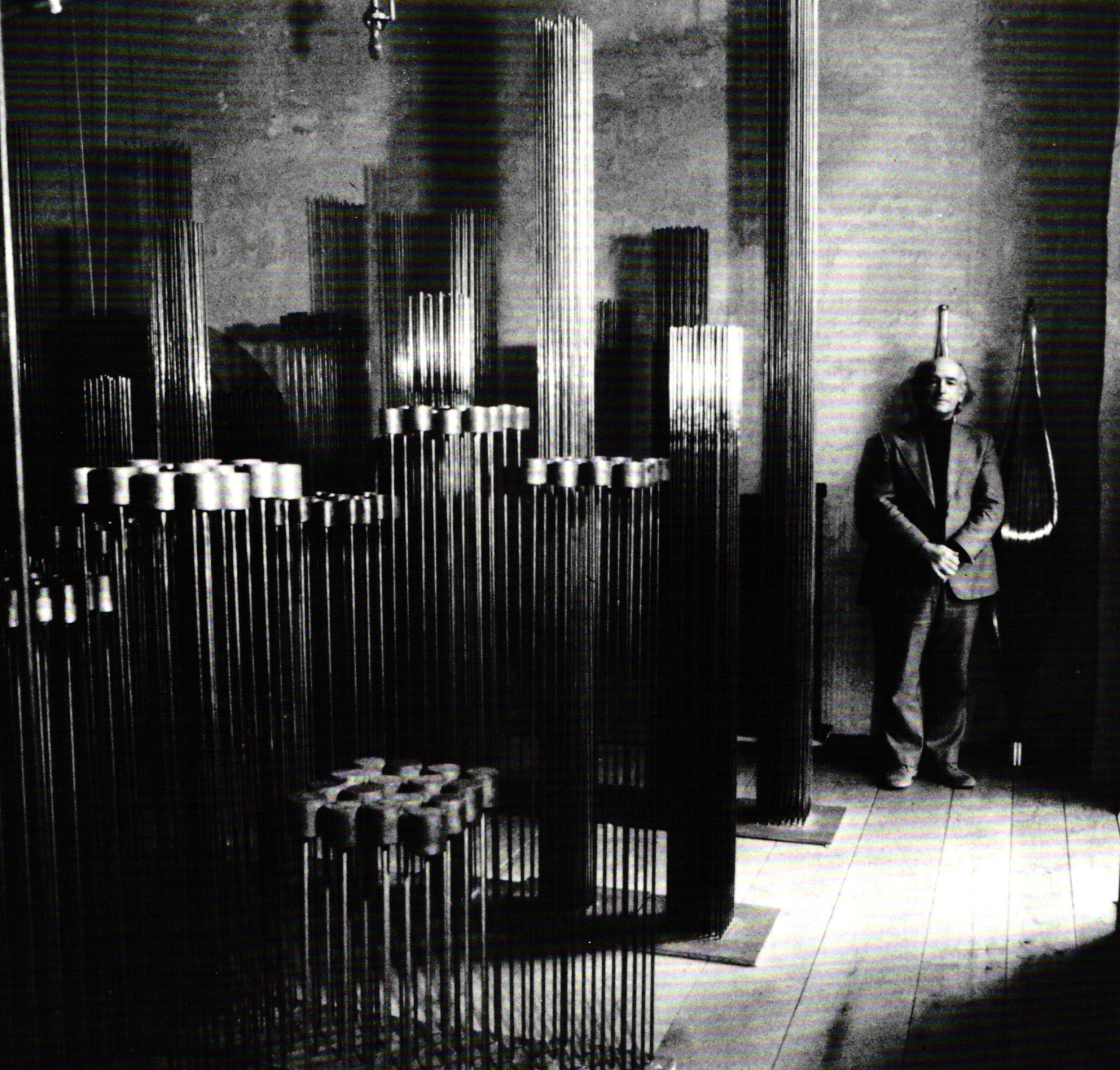 Meanwhile, new ideas were appearing in Bertoia's work in an entirely new dimension—sound. Noticing the musical tones of vibrating metal, Bertoia set out to control these sounds, experimenting with alloys, the shape, length and density of the forms, the combinations of other metals and movement caused by wind and touch. He developed the musical pieces with his brother Oreste, an amateur musician, assisting in controlling the tonal range of the metals. Around 1965 he began assembling musical pieces in his studio for concerts, and in February 1975 he installed the most extraordinary of the "sounding sculptures" at the Standard Oil Company Plaza in Chicago. Banks of freestanding vertical rods are spaced throughout a long reflecting pool to catch the wind as it sweeps across the plaza. As they hum and buzz with the changing wind velocity, they provide a never-ending concert for passersby. At the dedication ceremony, Bertoia himself waded into the pool to "play" the vibrating rods for the audience.