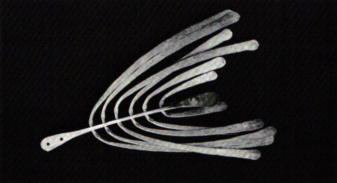 During his tenure at Cranbrook Bertoia peddled his jewelry around campus in the studios and offices. As the war effort escalated, metals became increasingly difficult to obtain. Much of the early wire jewelry, reportedly, was made from scraps found around the metal shop. A series of brooches comprised of delicately hammered sections of wire was produced in 1942-43. Flattened at each end, soft, faceted petal shapes were joined along a spine or clustered together with tiny rivets, suggestive of wavy, underwater flowers or sea creatures. The reference to natural forms is broad and can never quite be grasped or identified. These designs are, in the final assessment, abstract and nonrepresentational, but so evocative and mysterious as to trigger some half-forgotten, distant memory. They relate to the humorous and yet vaguely unsettling vision of Paul Klee or Alexander Calder.