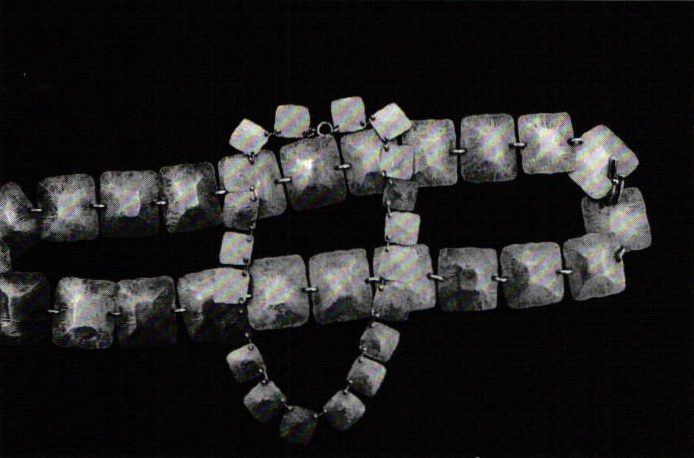 Other hammered pieces include a necklace and belt made in the 1940s of square, slightly domed links. The surface texture so carefully produced in this case contradicts the smooth, uninterrupted gloss of the earlier coffee/ tea services. Repetitive, slightly varying units held Bertoia's interest throughout his career. The early jewelry composed of similar but individualistic hammered wires, the square links of the necklace and belt, underscore a design philosophy Bertoia used to produce his well-known chair design for Knoll Associates (later Knoll International) in 1952. Like the work on paper and in metal, the chairs are based on a repeated module, which, in turn, determines the shape of the whole, ". . . like a cellular structure."