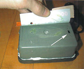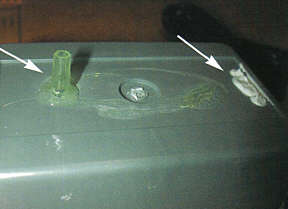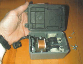 Figure 2 shows some of the steps involved in modifying an aquarium pump to be a vacuum source. No two pumps seem to be the same, so these pictures may not apply exactly to any pump that you try to modify. But hopefully the principal will be the same. Standard pumps blow air out of a nozzle; the incoming air is sucked into the pump through the cracks around the power cord and around the base, and through various other holes in the plastic housing. I bought a medium capacity pump, took the bottom off the case (Figure 2A), filled all the holes and cracks, and sealed the bottom of the case, using bathtub caulk (Figure 2B, C, and E). I drilled a hole in the top of the case (Figure 2D); this is now the air inlet, so that when the pump is turned on, air is sucked in through this hole. I glued a plastic fitting over the hole (Figure 2F). The fitting is the large end of a pipet tip.