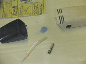 Shown on this page is another type of enamel vacuum, made from a handheld mini vacuum used to remove dust from computer keyboards. In our version, a stainless steel dispensing needle is attached to a piece of PVC tubing. The tubing, which does not have a large enough OD to fill the opening of the vacuum, is inserted into a metal fitting, which fills the vacuum opening enough to create a gentle suction through the tube.