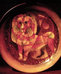 The Ameses, painters who specialized in murals made from ceramic mosaics, were, in fact, first inspired to try enameling after viewing an exhibition of Drerup's work at Scripps College in Claremont, California, in 1940. According to Jean Ames, "[M]aterial, kilns, and methods were then unknown in California." When Arthur returned home after serving in World War II, they began experimenting with jewelers' enamel in a small kiln, built for them by a ceramist friend. Like Drerup, their manner of working was slow and based upon the deliberate buildup of transparent over opaque enamel. The couple worked both together and individually. Jean's style, inextricably linked to subject matter—angels, sprites, and "enchanted" birds and beasts—was delicate and ephemeral, while Arthur's was bold and abstract.