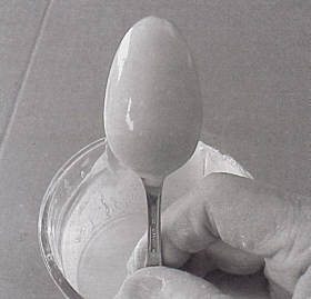 The water is forming its own container within the measuring cup, Figure 8. A palette knife is ideal for pulling the dry powder into the center without disturbing the wall of the inside container. Very little additional water will be required to make the entire top surface appear moist. Begin to stir with the palette knife, add a little water, check the thickness of the coating on the knife, and continuing until the desired coating thickness is obtained. Again, the last step is screening the enamel. The author prefers this method because it is easier to estimate how much powder might be needed for a project than the amount of water. Starting with a mix which is too thick, needing only water to make a workable material, is more reassuring than starting with one so thin and hoping you will have enough powder to arrive at a good product. Plus, this latter method is more versatile. Figure 9 shows a small amount being mixed in a table spoon.