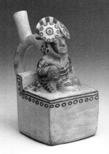 The ruler seated on the square throne (FIGURE 4) is accompanied by a Pampas cat and he wears a short tunic made of metal platelets. His wristbands, earspools, large necklace, and double-disc headdress were most likely also made of shining metal. He is literally clothed in symbols that display his high office; the clothes and ornament make the man. The gilt copper head (FIGURE 3) served as a headdress insignia worn by a high ranking official. Gilded, silvered, gold, and silver objects were exclusively made for and worn by the elite and almost all precious metal was worked to create status emblems and ritual objects to indicate office, and luxury items for dress and ornament.