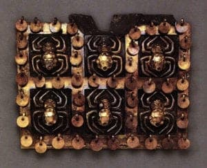 Now with large quantities of metalwork coming to light from elite Moche tombs, it is evident that there was a great demand for the production of status emblems, jewelry, and ritual adornments. Moche smiths working for the elite were encouraged to excel in their craft because their products served to perpetuate the social hierarchy and ensure the visual association of the priests, lords, and military officers with the sacred powers of nature. It is certain the metalsmiths never sat idle. In Moche society there was no tradition of passing on the luxury items of the royal household to the next generation. Thus, their products were necessary in large quantities as objects for office both in this world and the afterworld.