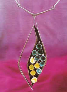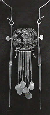 Expatriate New Yorker Alvin Pine, who received his M.F.A. in metals from Cranbrook Academy of Art in Bloomfield Hills , Michigan , taught at CSULB from 1962-96, replacing Hein when he went to Fullerton . Although Pine stopped making jewelry in 1972, his influence was profound. Working in an expansive e, flexible, and often kinetic format, informed by his extensive travels, Pine epitomized the individualistic California "frontier spirit" at once sophisticated, "ethnic," and free. [13] Pine's use of lengthy, contiguous dangling wires in his sizable necklaces is reminiscent or brooches by Hein as well as of pieces by Ziegfeld, which is not surprising given their mutual acquaintanceship at CSULB. As a teacher, Pine had a great impact on those fortunate enough to come under his aegis. He counts among his roster of students master jewelers Marcia Lewis Gars Griffin (currently chairman of the metals department at Cranbrook Academy of Art), Carolyn Utter Rodakovich, and Linda Watson-Abbott.