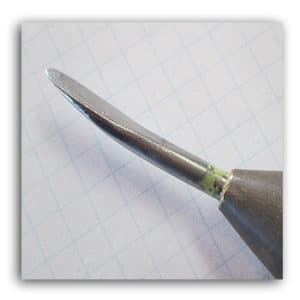 "I took my X-Acto knife #11 blade and snapped off the tip and then ground it back about 1 to 1.5 mm at a 45-degree angle," he explains. "I use it at my wax bench for cutting seats. I insert the knife and use the new angle to drag it around the hole to create a step or seat for a stone in the wax.