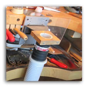 To create a more effective dust collector, Hoch began by disposing of the fish mouth and attaching a piece of PVC pipe to the vacuum tubing. She then created a new bench pin from a piece of 3/4-inch-thick wood with an opening to accommodate the end of the vacuum hose, which rises up underneath the pin. "It's unbelievably useful," she says.