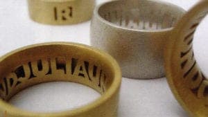 Anja Pietrowski's plastic rings in different shade of red and her rings made of gold or silver can be inserted flexibly